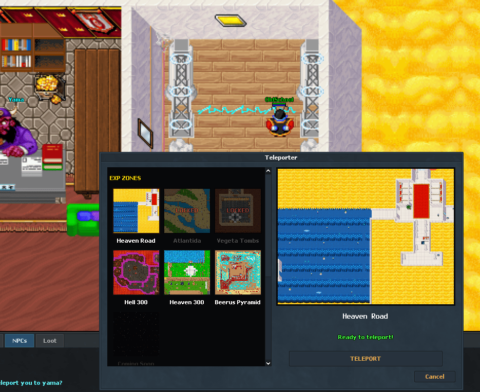 You start the game with a basic equipment set in your bag — equip it right away. Then approach Yama and say Hi (or right-click him) to get teleported to the Temple.